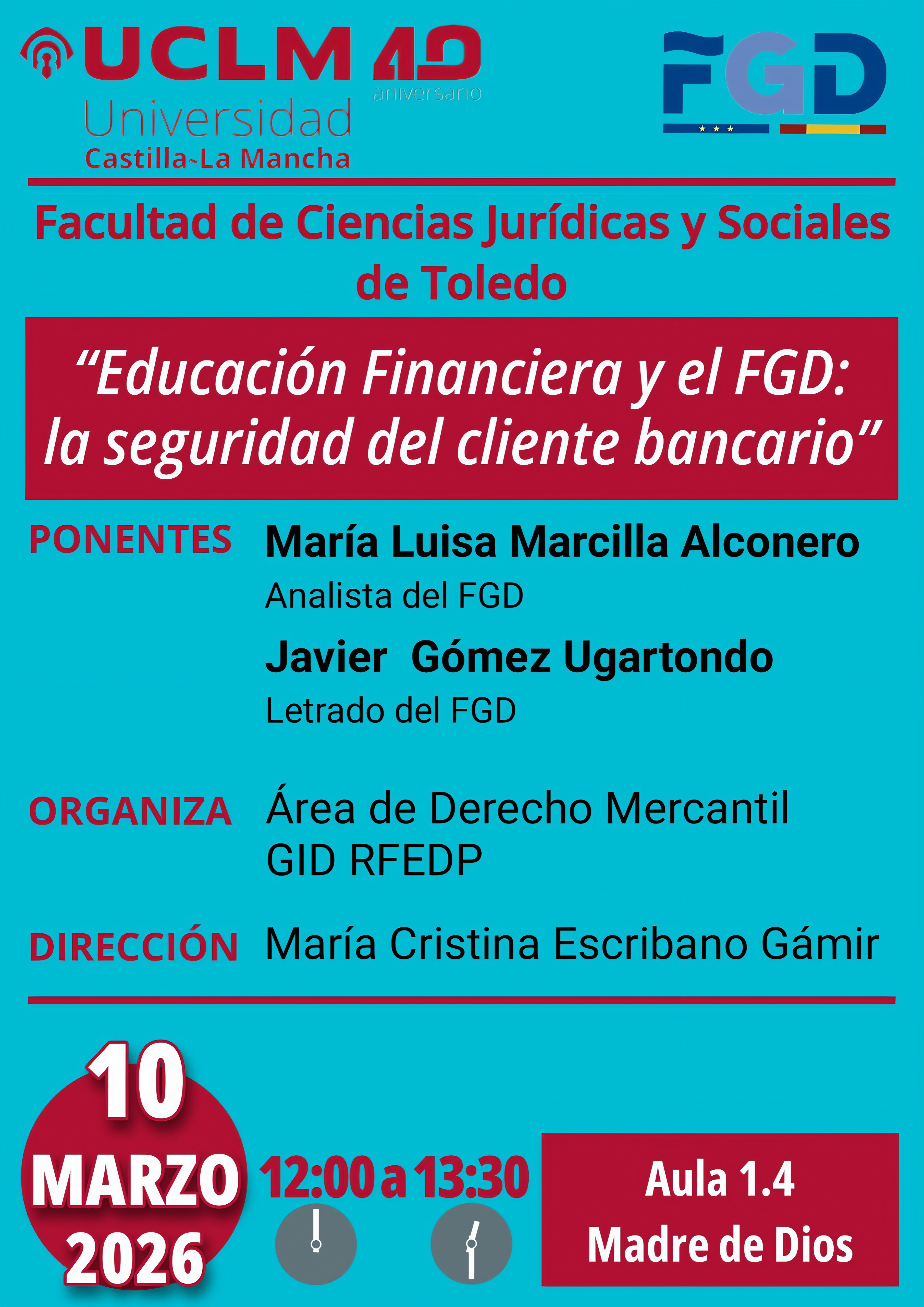 Con el título, Educación Financiera y el FGD: la seguridad del cliente bancario, María Luisa Marcilla Alconero, economista del Fondo de Garantía de Depósitos y Javier Gómez Ugartondo, Letrado de este, nuestra facultad recibe a la institución pública que tiene como función garantizar los depósitos en entidades de crédito tanto en dinero como en valores, contribuyendo con ello a la estabilidad del sistema financiero a través de la confianza de los depositantes.