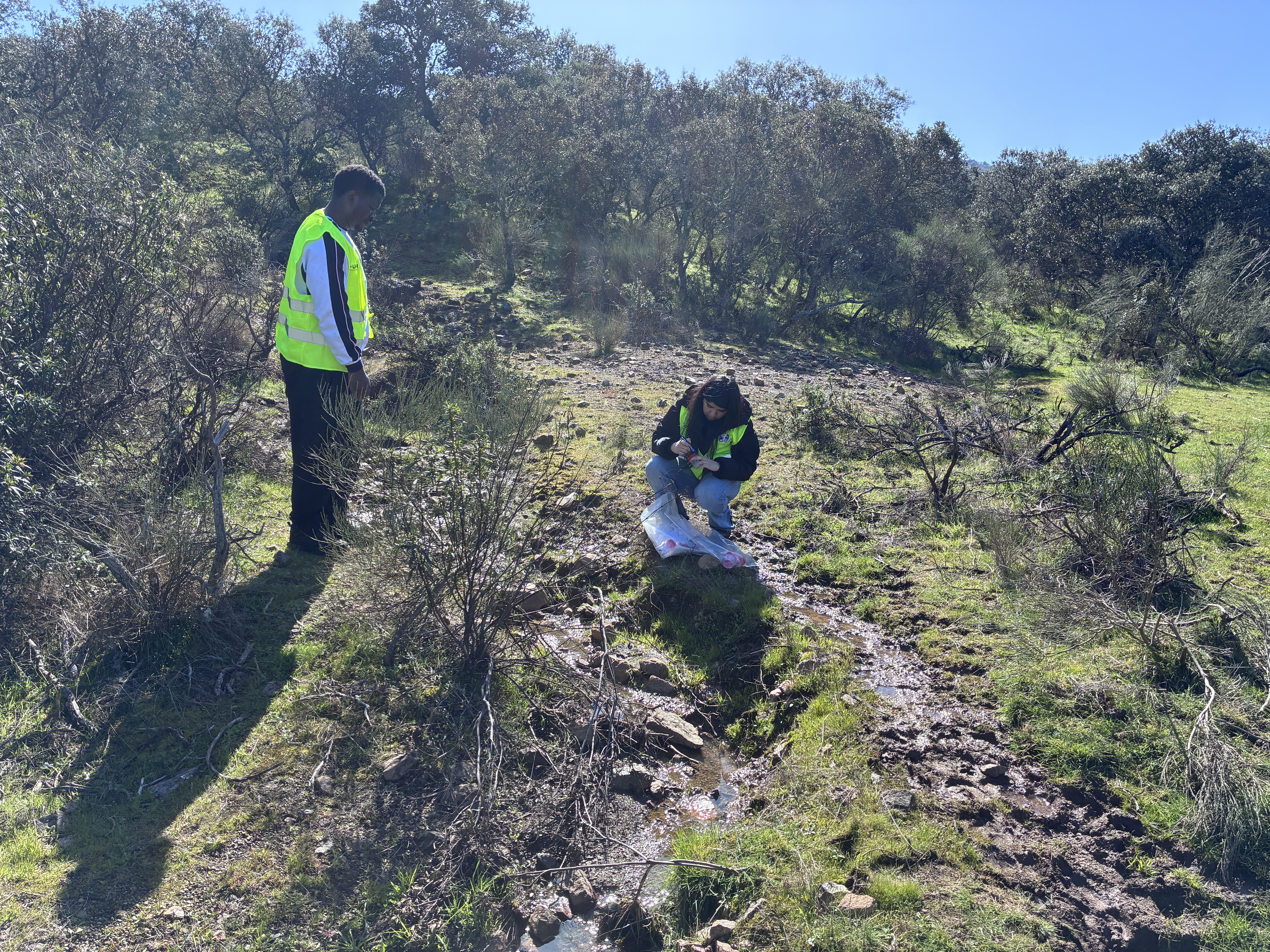 Tomando muestra de sedimento de arroyo.