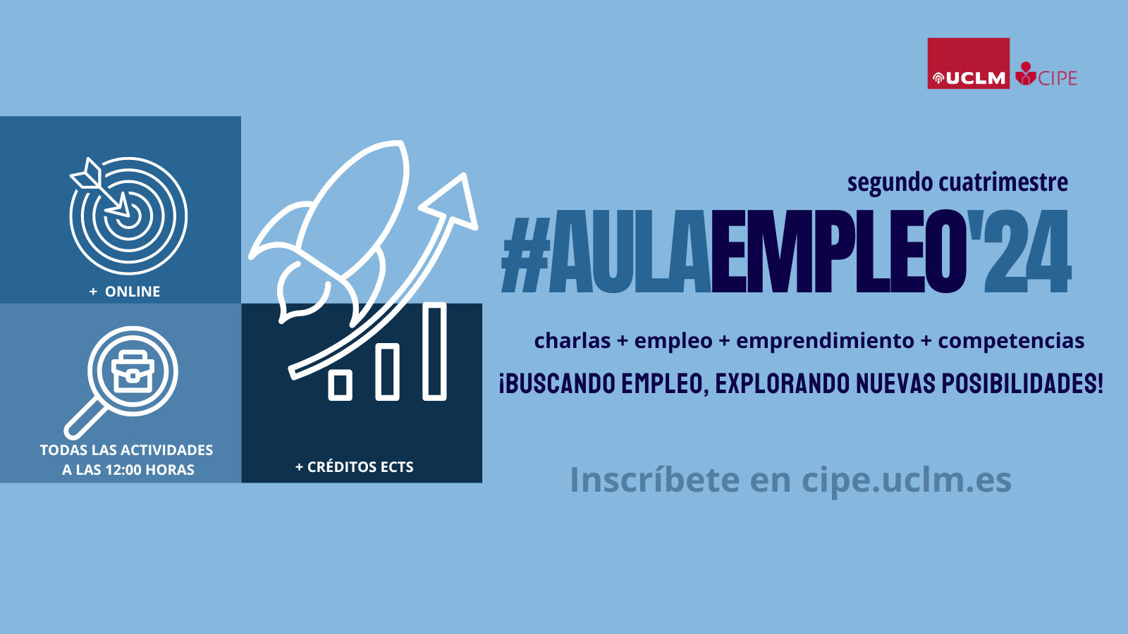 En este segundo cuatrimestre tendrá lugar en la Universidad de Castilla-La Mancha (UCLM) una nueva edición del programa #Aulaempleo24. Organizado por el Centro de Información y Promoción del Empleo (CIPE), el programa presenta actividades todas las semanas orientadas al empleo, el desarrollo de competencias y el emprendimiento, dirigidas a estudiantes y egresados/as de la UCLM.